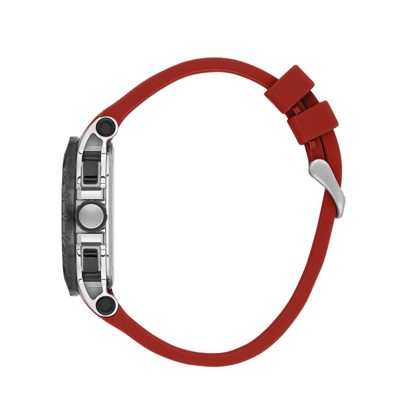 Впечатляващ модел мъжки часовник от колекцията Prive. Корпус изработен от неръждаема стомана. Червена силиконова каишка. Диаметър на корпуса 45.5 мм. Стъкло минерал-кристал. Черен дисплей хронограф със скелетонизиран дизайн. Часовникът се задвижва от кварцов механизъм VX9J. Водоустойчивост 10 ATM - позволява мокрене, къпане и плуване във водни басейни.