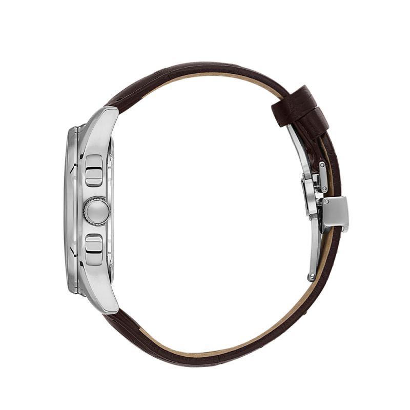 Мъжки часовник Daniel Klein с елегантен дизайн от колекцията Exclusive. Моделът е със син мултифункционален дисплей с показатели за дата, ден от седмицата и двойно време. Корпус изработен от метал. Тъмнокафява каишка от естествена кожа. Стъкло минерал-кристал. Диаметър на корпуса 44 мм. Часовникът се задвижва от кварцов механизъм JP25-4.5. Водоустойчивост 5 ATM - допускат се леки пръски и взимане на душ, не се препоръчва обилно мокрене.