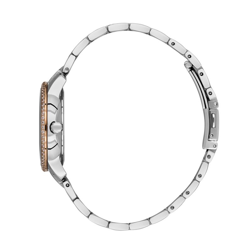 Дамски часовник с нежна визия от колекцията Unique. Моделът е с корпус и верижка от неръждаема стомана. Диаметър на корпуса 32 мм. Часовникът е със сребрист аналогов дисплей с показател за лунна фаза. Красива декорация от инкрустирани кристали по дисплея и безела. Стъкло минерал-кристал. Задвижва се от кварцов механизъм VX3WE11. Водоустойчивост 5 ATM - допускат се леки пръски и взимане на душ, не се препоръчва обилно мокрене.