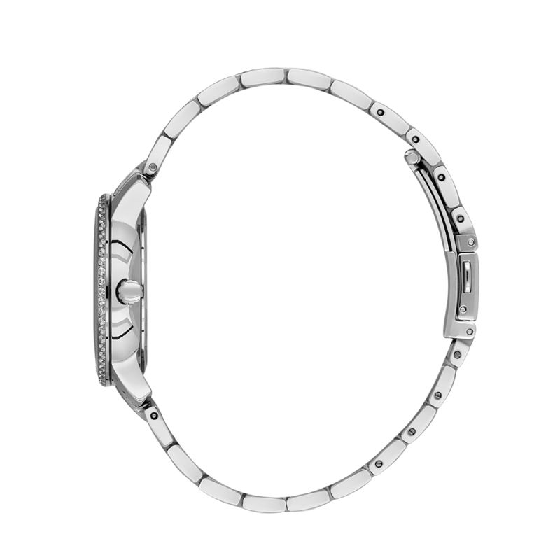 Дамски часовник с нежна визия от колекцията Unique. Моделът е с корпус и верижка от неръждаема стомана. Диаметър на корпуса 32 мм. Часовникът е със сребрист аналогов дисплей с показател за лунна фаза. Красива декорация от инкрустирани кристали по дисплея и безела. Стъкло минерал-кристал. Задвижва се от кварцов механизъм VX3WE11. Водоустойчивост 5 ATM - допускат се леки пръски и взимане на душ, не се препоръчва обилно мокрене.