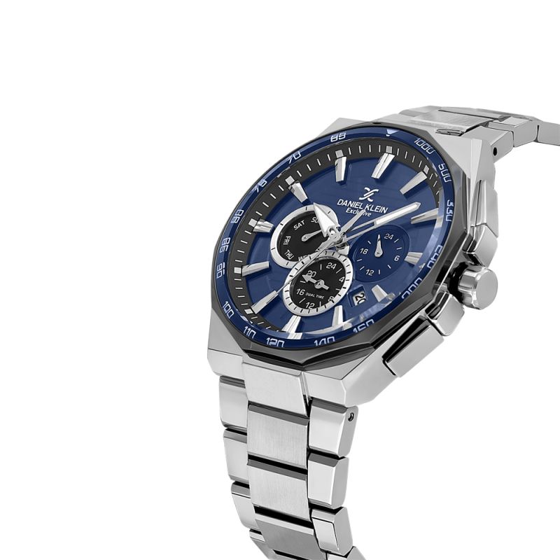 Мъжки часовник Daniel Klein със спортно-елегантен дизайн от колекцията Exclusive. Моделът е с метален корпус и верижка от неръждаема стомана. Диаметър на корпуса 44.5 мм. Мултифункционален дисплей с показатели за дата, ден от седмицата и двойно време. Стъкло минерал-кристал. Часовникът се задвижва от кварцов механизъм JP25-4.5. Водоустойчивост 5 ATM - допускат се леки пръски и взимане на душ, не се препоръчва обилно мокрене.