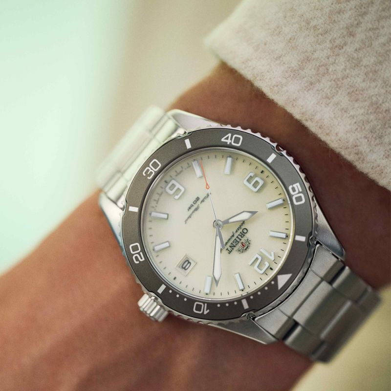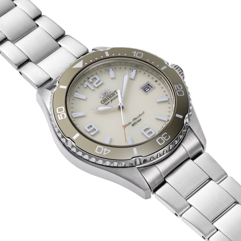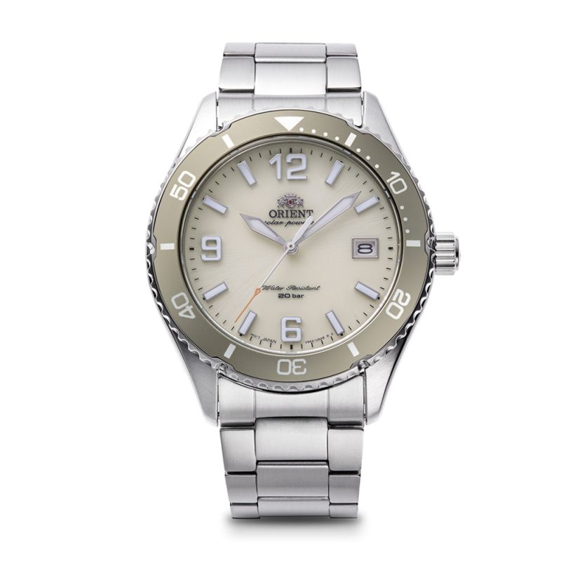 Мъжки часовник Orient със спортен водолазен стил и семпъл дизайн. Моделът е с компактен корпус от 39.9 мм. Аналогов дисплей в бежов цвят с показател за дата. Въртящ се безел в сив цвят от алуминий. Корпус и верижка изработени от неръждаема стомана. Стрелките, индексите и цифрите са с луминисцентно покритие. Стъклото е сапфир-кристал. Задвижва се от соларен механизъм. Водоустойчивост 20 ATM - позволява мокрене, къпане, плуване и гмуркане във водни басейни.