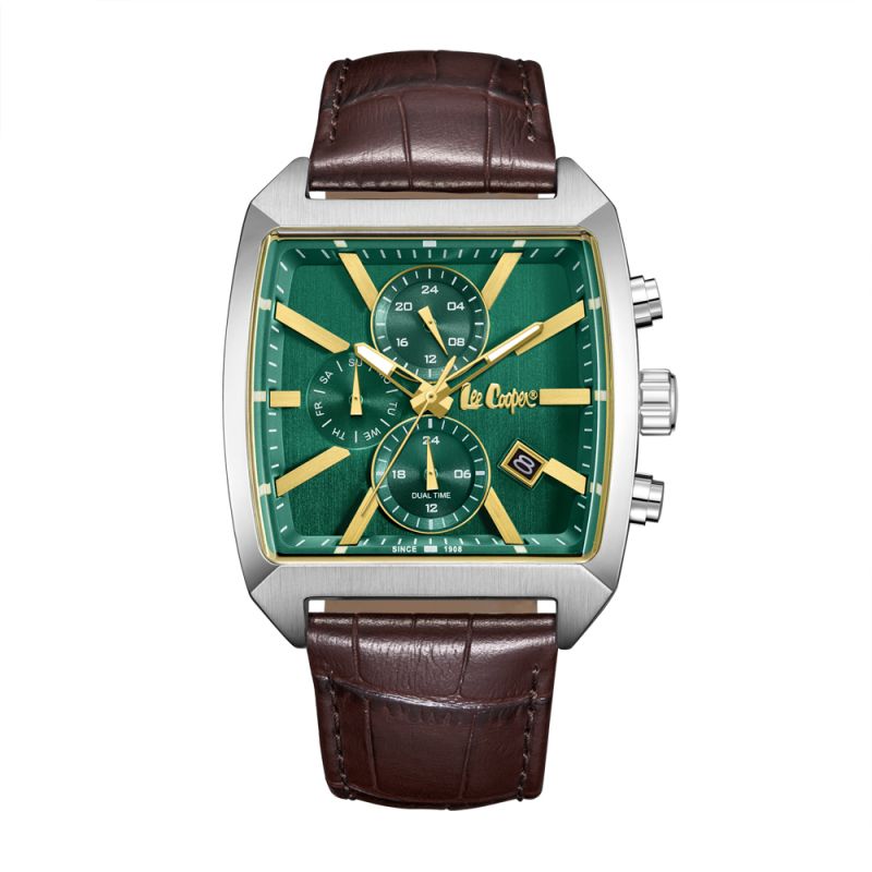 Стилен мъжки часовник Lee Cooper. Мултифункционален дисплей в зелен цвят със златисти детайли, показатели за дата, ден от седмицата, 24-часов формат и двойно време. Стъкло минерал-кристал. Корпус от супер метал - специална сплав, създадена от марката. Кафява каишка от естествена кожа. Задвижва се от кварцов механизъм. Водоустойчивост 5 ATM - допускат се леки пръски и взимане на душ, не се препоръчва обилно мокрене.