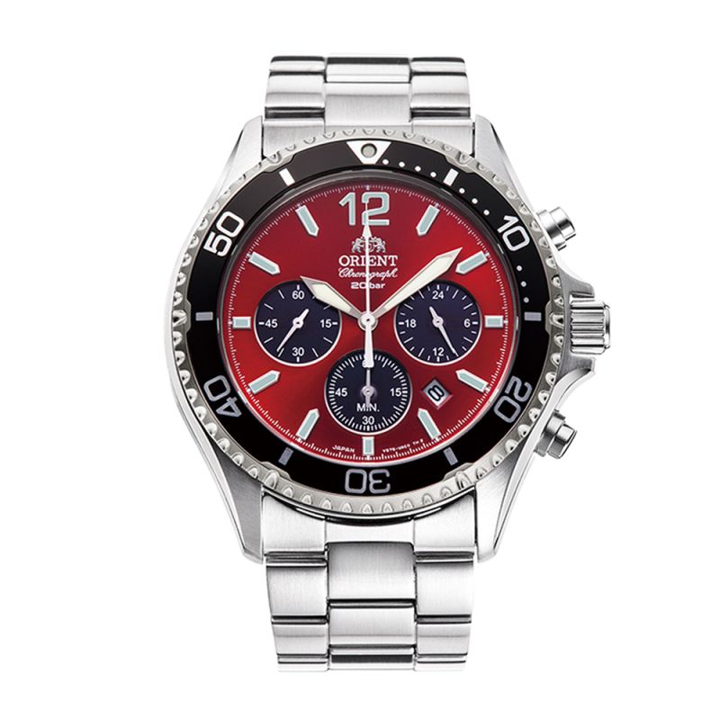 Мъжки часовник Orient със спортно-ежедневен дизайн. Моделът е часовник хронограф със слънчева енергия. Захранва се чрез преобразуване на енергията, получена от слънчева светлина и други източници на светлина, в електрическа енергия, така че няма нужда от смяна на батерии. Това го прави удобен за ежедневна употреба и дейности на открито, когато се използва функцията хронограф. Моделът е с еднопосочен въртящ се безел. Зареждането на слънчевата батерия се осъществява чрез трите допълнителни циферблата: 24-часов индикатор на 3 часа, 60-минутен брояч на 6 часа и малък втори циферблат на 9 часа. Стрелките, индексите и цифрата 12 са с луминисцентно покритие. Стъклото е сапфир-кристал. Водоустойчивост 20 ATM - позволява мокрене, къпане, плуване и гмуркане във водни басейни.