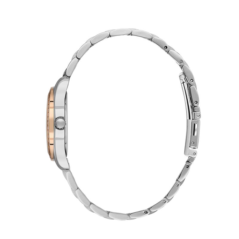 Нежен дамски часовник с красива визия от колекцията Unique. Моделът е със седефен аналогов дисплей, декориран с кристали по часовите маркери и по безела. Корпусът и верижката са изработени от неръждаема стомана. Стъкло минерал-кристал. Задвижва се от кварцов механизъм 2035. Водоустойчивост 5 ATM - допускат се леки пръски и взимане на душ, не се препоръчва обилно мокрене.