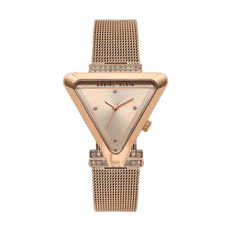 Впечатляващ дамски часовник Daniel Klein с елегантна визия в цвят розово злато от колекцията Premium. Моделът е с декорация от инкрустирани кристали от две страни на корпуса, при свързването с верижката и по циферблата. Дисплеят е аналогов със стилен дизайн. Стъклото е минерал-кристал. Часовникът е с метален корпус и меш верижка от неръждаема стомана. Задвижва се от кварцов механизъм 2035. Водоустойчивост 3 ATM - допускат се леки пръски, не се препоръчва обилно мокрене.