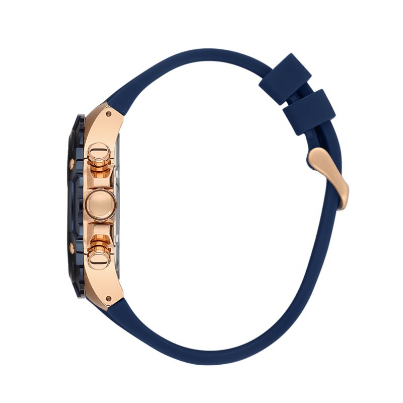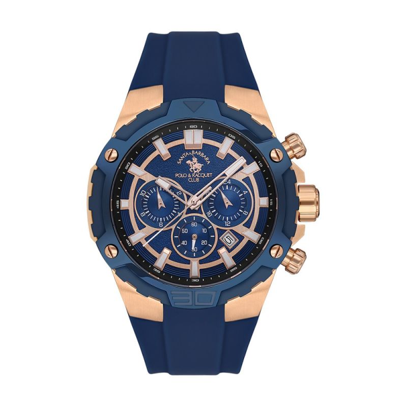 Впечатляващ модел мъжки часовник Santa Barbara Polo & Racquet Club със спортен дизайн от колекцията Prive. Син мултифункционален дисплей с детайли в цвят розово злато. Луминесцентно покритие на стрелките и индексите. Корпус изработен от неръждаема стомана в комбинация със силиконова каишка. Стъкло минерал-кристал. Задвижва се от кварцов механизъм с калибър VD33-4.5. Диаметър на корпуса 47 мм. Водоустойчивост 10 ATM - позволява мокрене, къпане и плуване във водни басейни.