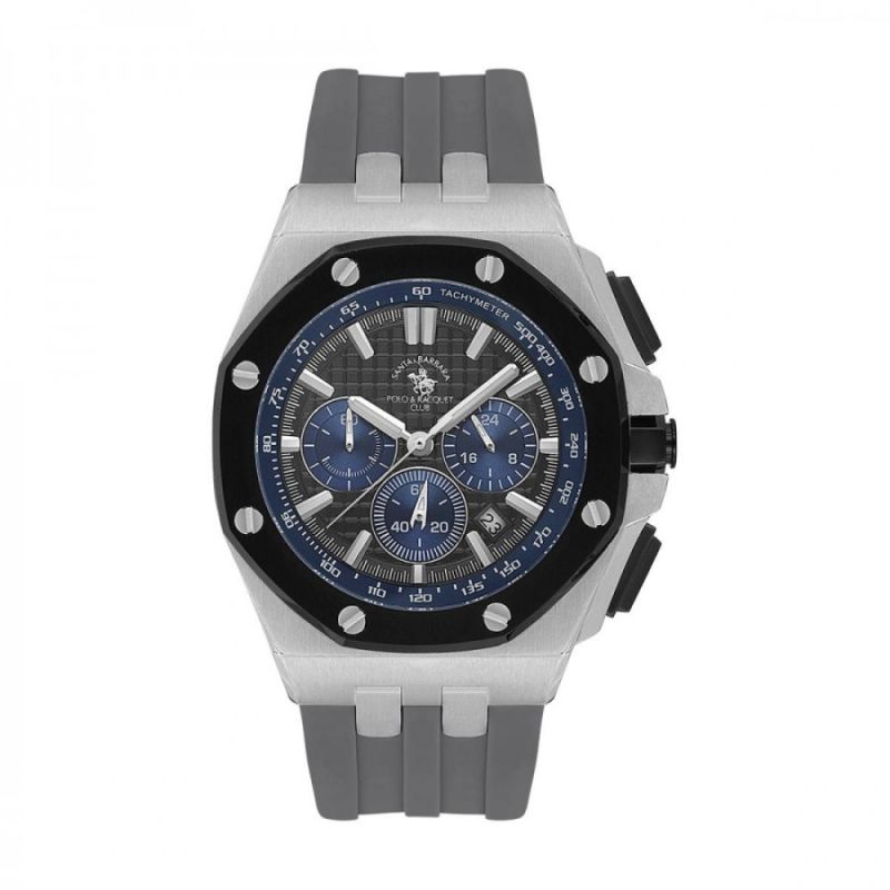 Мъжки часовник Santa Barbara Polo & Racquet Club със спортно-елегантен дизайн от колекцията Prive. Сив дисплей хронограф с детайли в цвят син и сребрист.. Луминесцентно покритие на стрелките и индексите. Стъкло минерал-кристал. Корпус от неръждаема стомана в комбинация със силиконова каишка. Диаметър на корпуса 44.8 мм. Задвижва се от кварцов механизъм с калибър VD53C14. Водоустойчивост 5 ATM - допускат се леки пръски и взимане на душ, не се препоръчва обилно мокрене.