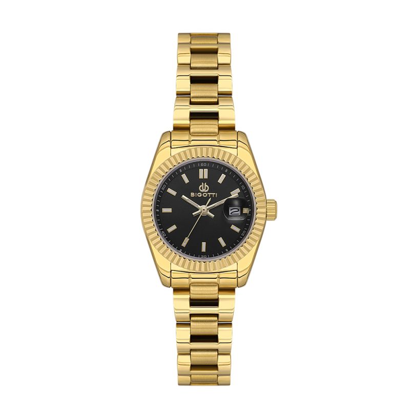 Дамски часовник Bigotti с класически дизайн от колекцията Quotidiana. Моделът е с кропус от месинг и верижка от неръждаема стомана. Аналогов дисплей в черен цвят с показател за дата. Луминисцентно покритие върху стрелките и индексите. Стъкло минерал-кристал. Диаметър на корпуса 27 мм. Часовникът се задвижва от кварцов механизъм. Водоустойчивост 3 ATM - допускат се леки пръски, не се препоръчва обилно мокрене.