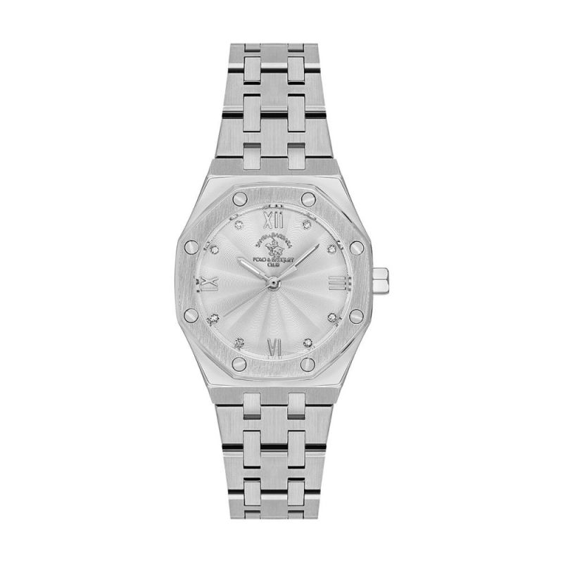 Класически модел дамски часовник Santa Barbara Polo & Racquet Club със стилен дизайн от колекцията Luxury. Сребрист аналогов дисплей с декорация от нежни кристали върху част от индексите. Стъкло минерал-кристал. Корпус и верижка изработени от неръждаема стомана. Диаметър на корпуса 30 мм. Задвижва се от кварцов механизъм с калибър 2035. Водоустойчивост 5 ATM - допускат се леки пръски и взимане на душ, не се препоръчва обилно мокрене.