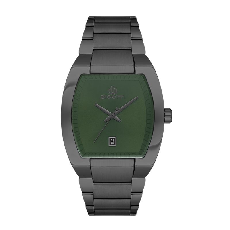 Спортно-елегантен мъжки часовник Bigotti от колекцията Raffinato. Корпусът е изработен от месинг. Верижката е от неръждаема стомана. Дисплеят е аналогов в тъмнозелен цвят със сиви акценти и с показател за дата. Стъклото е минерал-кристал. Задвижва се от кварцов механизъм калибър VX42E12S.  Водоустойчивост 5 ATM - допускат се леки пръски и взимане на душ, не се препоръчва обилно мокрене.