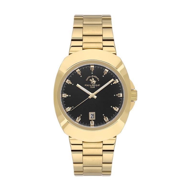 Мъжки часовник Santa Barbara Polo & Racquet Club със спортно-елегантен дизайн от колекцията Legend. Черен аналогов дисплей със златисти детайли и показател за дата. Стъкло минерал-кристал. Корпус и верижка изработени от неръждаема стомана. Диаметър на корпуса 39 мм. Задвижва се от кварцов механизъм с калибър 2315-6. Водоустойчивост 5 ATM - допускат се леки пръски и взимане на душ, не се препоръчва обилно мокрене.