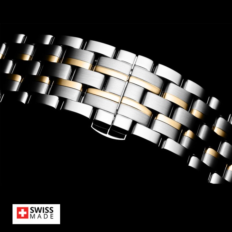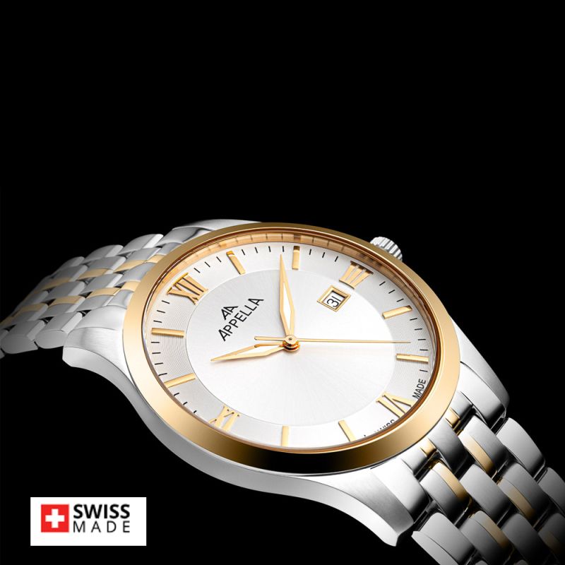 Стилен мъжки часовник Appella L12004.1167Q с корпус и верижка от неръждаема стомана. Сребрист циферблат със златисти детайли и показател за дата. Стрелките са с луминисцентно покритие. Стъклото е сапфир-кристал. Часовникът се задвижва от кварцов механизъм ETA F06 Swiss Made. Диаметър на корпуса 42 мм. Водоустойчивост 5 ATM - допускат се леки пръски и взимане на душ, не се препоръчва обилно мокрене.