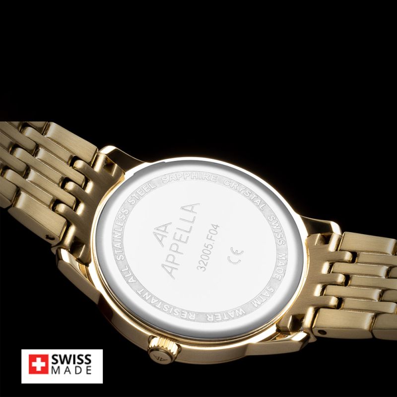 Дамски часовник Appella Classic L32005.1161Q в златист цвят. Аналогов дисплей с класически дизайн и индикатор за дата. Корпус и верижка изработени от неръждаема стомана. Стъкло сапфир-кристал. Задвижва се от кварцов механизъм ETA F04 Swiss Made. Диаметър на корпуса 30 мм. Водоустойчивост 5 ATM - допускат се леки пръски и взимане на душ, не се препоръчва обилно мокрене.
