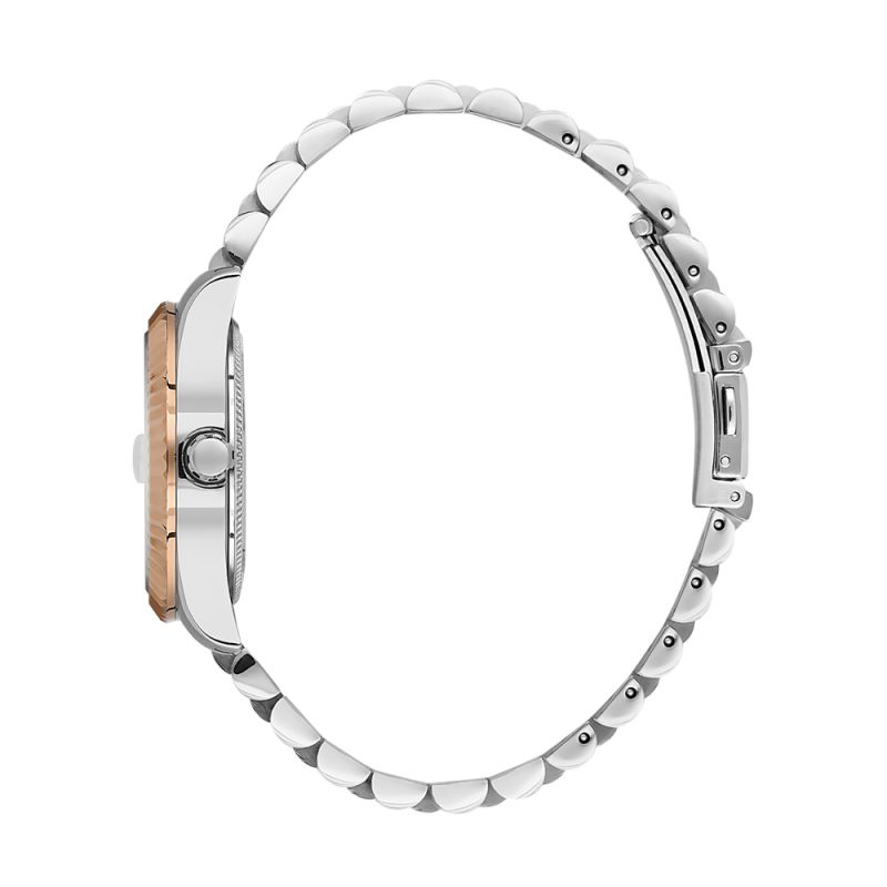 Красив дамски часовник от колекцията Unique. Моделът е с корпус и верижка от неръждаема стомана. Сребрист текстуриран дисплей с декорация от нежни кристали по часовите маркери и с показател за дата. Диаметър на корпуса 34 мм. Стъкло минерал-кристал. Задвижва се от кварцов механизъм. Водоустойчивост 5 ATM - допускат се леки пръски и взимане на душ, не се препоръчва обилно мокрене.