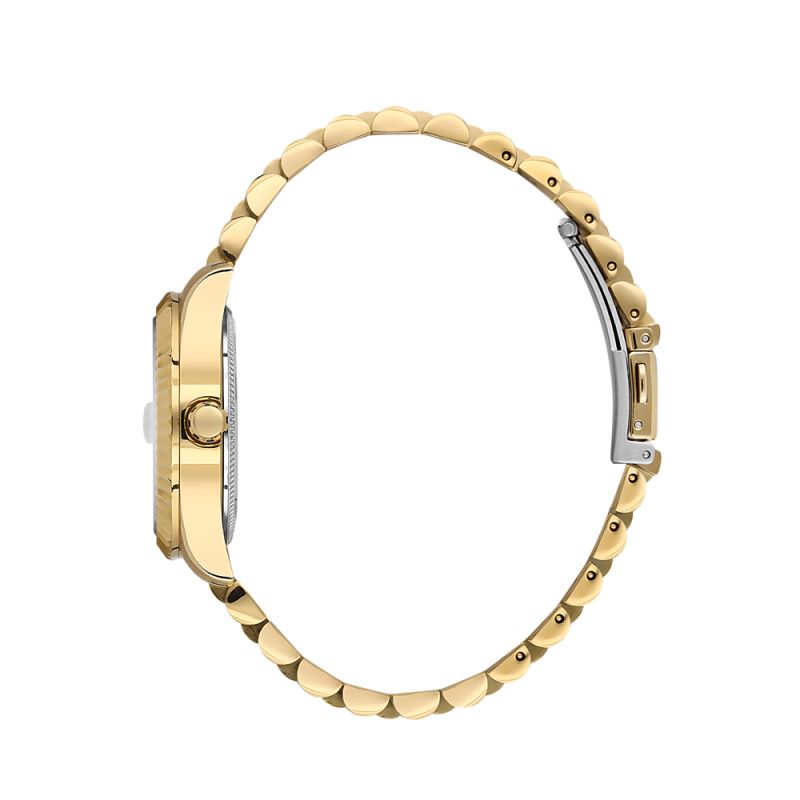 Красив дамски часовник от колекцията Unique. Моделът е с корпус и верижка от неръждаема стомана. Сребрист текстуриран дисплей с декорация от нежни кристали по часовите маркери и с показател за дата. Диаметър на корпуса 34 мм. Стъкло минерал-кристал. Задвижва се от кварцов механизъм. Водоустойчивост 5 ATM - допускат се леки пръски и взимане на душ, не се препоръчва обилно мокрене.