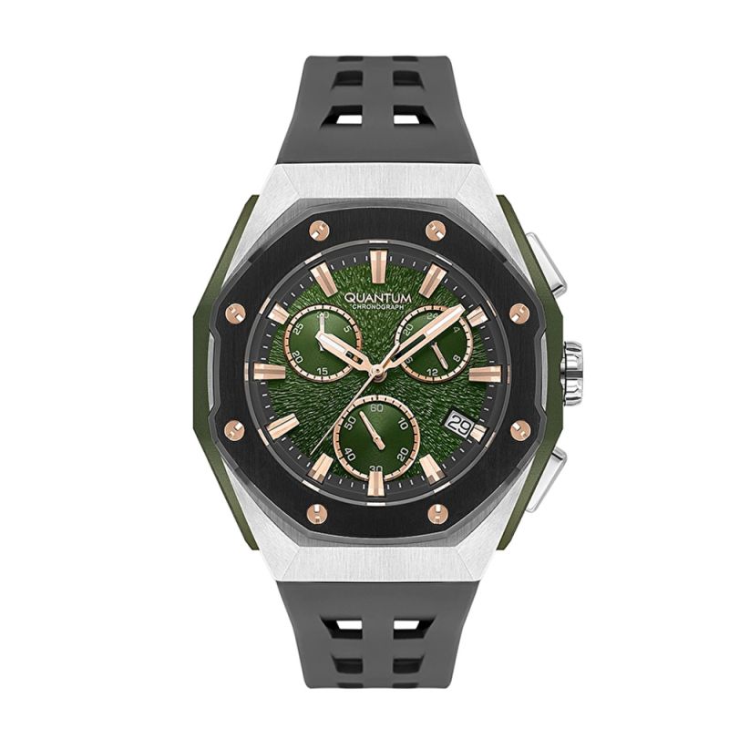 Мъжки часовник Quantum със спортен дизайн от колекцията Hunter. Дисплей хронограф в тъмнозелен цвят с детайли в цвят розово злато. Луминесцентно покритие върху стрелките. Стъкло минерал-кристал . Корпус от неръждаема стомана в комбинация със силиконова каишка. Задвижва се от кварцов механизъм с калибър VR34B12. Диаметър на корпуса 46 мм. Водоустойчивост 10 ATM - позволява мокрене, къпане и плуване във водни басейни.