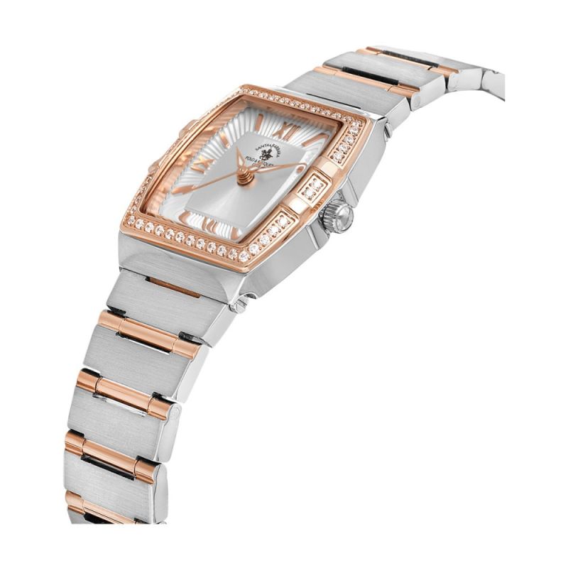 Дамски часовник Santa Barbara Polo & Racquet Club със стилен дизайн от колекцията Luxury. Моделът е със сребрсит аналогов дисплей и декорация от нежни кристали по безела. Корпус и верижка изработени от неръждаема стомана. Стъкло минерал-кристал. Задвижва се от кварцов механизъм с калибър VJ21C1. Водоустойчивост 5 ATM - допускат се леки пръски и взимане на душ, не се препоръчва обилно мокрене.
