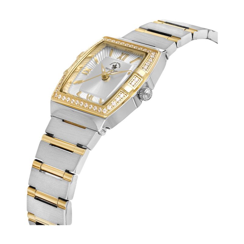 Дамски часовник Santa Barbara Polo & Racquet Club със стилен дизайн от колекцията Luxury. Моделът е със сребрсит аналогов дисплей и декорация от нежни кристали по безела. Корпус и верижка изработени от неръждаема стомана. Стъкло минерал-кристал. Задвижва се от кварцов механизъм с калибър VJ21C1. Водоустойчивост 5 ATM - допускат се леки пръски и взимане на душ, не се препоръчва обилно мокрене.