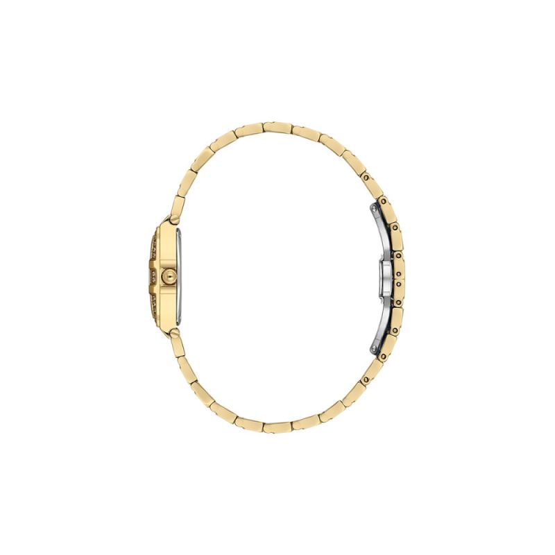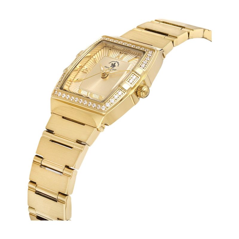 Дамски часовник Santa Barbara Polo & Racquet Club със стилен дизайн от колекцията Luxury. Моделът е със златист аналогов дисплей и декорация от нежни кристали по безела. Корпус и верижка изработени от неръждаема стомана. Стъкло минерал-кристал. Задвижва се от кварцов механизъм с калибър VJ21C1. Водоустойчивост 5 ATM - допускат се леки пръски и взимане на душ, не се препоръчва обилно мокрене.