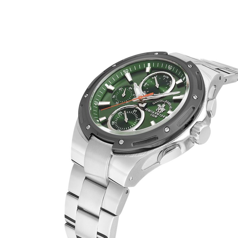 Мъжки часовник Santa Barbara Polo & Racquet Club със спортно-елегантен дизайн от колекцията Prive. Мултифункционален дисплей с показатели за дата, ден от седмицата и 24-часов формат. Луминесцентно покритие върху стрелките и индексите. Корпус и верижка изработени от неръждаема стомана. Диаметър на корпуса 44 мм. Стъкло минерал-кристал. Задвижва се от кварцов механизъм с калибър VX9NE. Водоустойчивост 5 ATM - допускат се леки пръски и взимане на душ, не се препоръчва обилно мокрене.