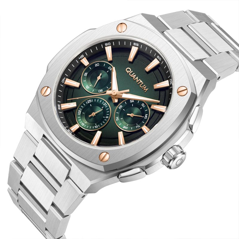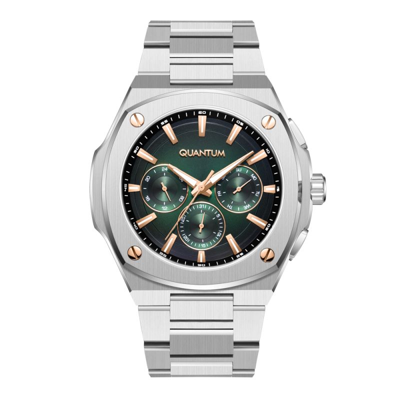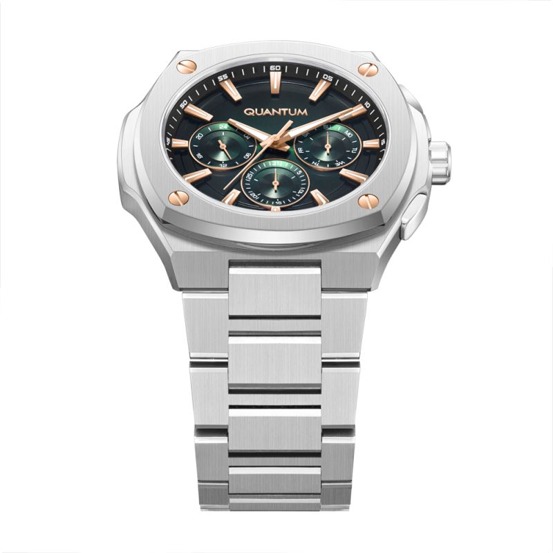 Мъжки часовник Quantum със спортно-ежедневен дизайн от колекцията Adrenaline. Зелен мултифункционален дисплей със златисти детайли. Луминесцентно покритие върху стрелките и индексите. Стъкло минерал-кристал. Корпус и верижка изработени от неръждаема стомана. Диаметър на корпуса 44 мм. Задвижва се от кварцов механизъм с калибър VX9J. Водоустойчивост 10 ATM - позволява мокрене, къпане и плуване във водни басейни.