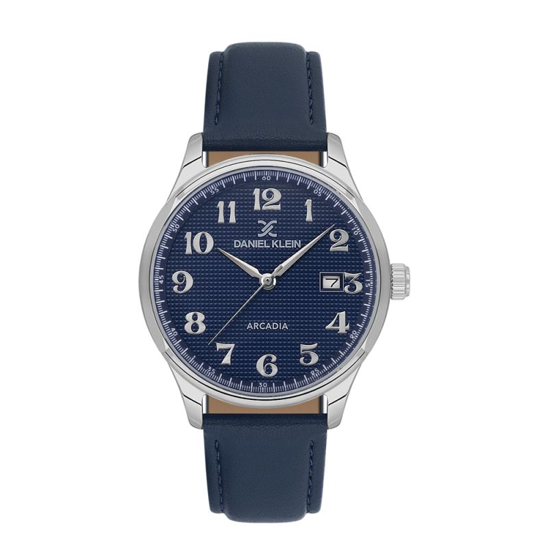 Класически модел мъжки часовник Daniel Klein със стилен дизайн от колекцията Arcadia. Дисплеят е аналогов с показател за дата. Корпусът е изработен от метал. Каишката е от естествена кожа. Стъклото е минерал-кристал. Часовникът се задвижва от кварцов механизъм VX42E11. Диаметър на корпуса 41 мм. Водоустойчивост 5 ATM - допускат се леки пръски и взимане на душ, не се препоръчва обилно мокрене.