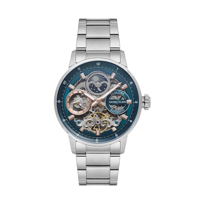 Мъжки часовник Daniel Klein от колекцията Skeleton. Моделът е с метален корпус и верижка от неръждаема стомана. Диаметъра на корпуса е 43 мм. Дисплеят е тип скелетон с показатели за двойно време и лунна фаза. Стъклото е минерал-кристал. Часовникът се задвижва от автоматичен механизъм Z2033. Водоустойчивост 5 ATM - допускат се леки пръски и взимане на душ, не се препоръчва обилно мокрене.