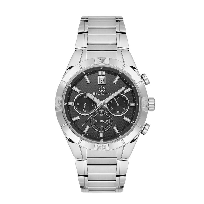 Мъжки часовник Bigotti със спортно-елегантен дизайн от колекцията Raffinato. Черен мултифункционален дисплей със сребристи детайли. Луминесцентно покритие върху стрелките и индексите. Стъкло минерал-кристал. Диаметър на корпуса 43 мм. Корпус изработен от месинг. Верижка от неръждаема стомана. Часовникът се задвижва от кварцов механизъм. Водоустойчивост 5 ATM - допускат се леки пръски и взимане на душ, не се препоръчва обилно мокрене.