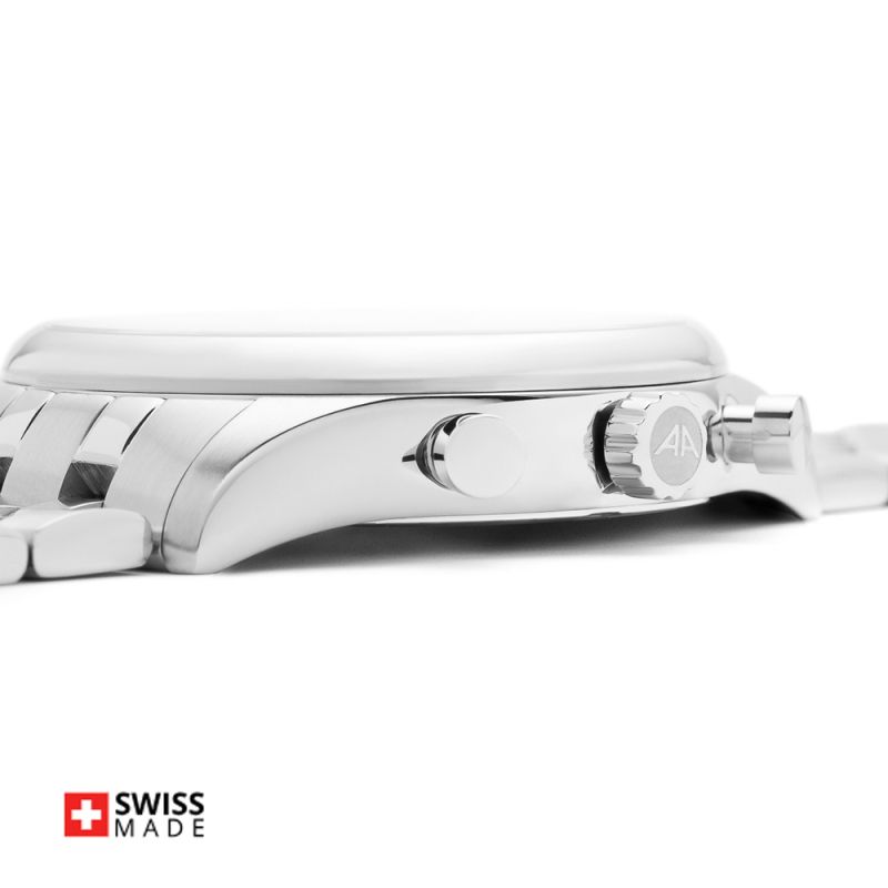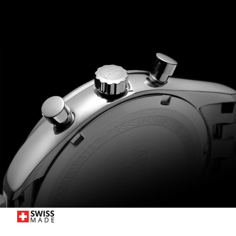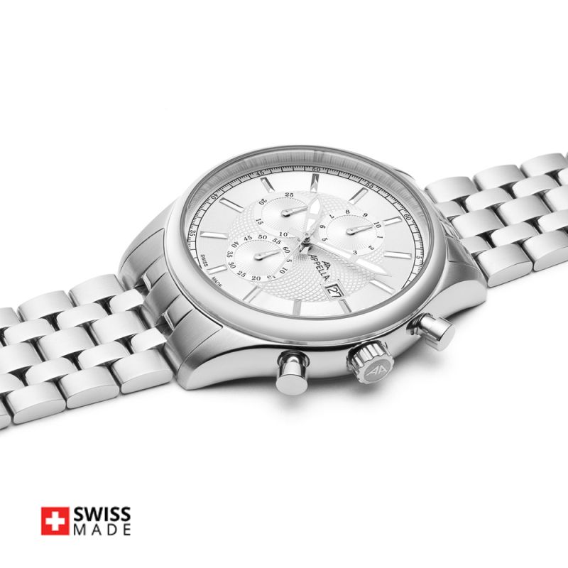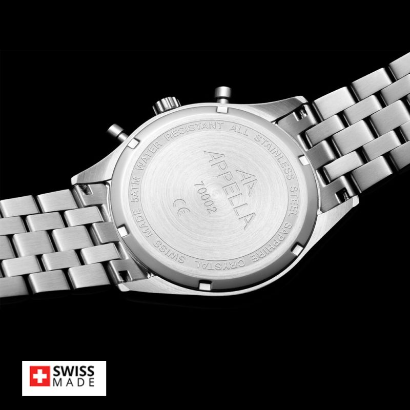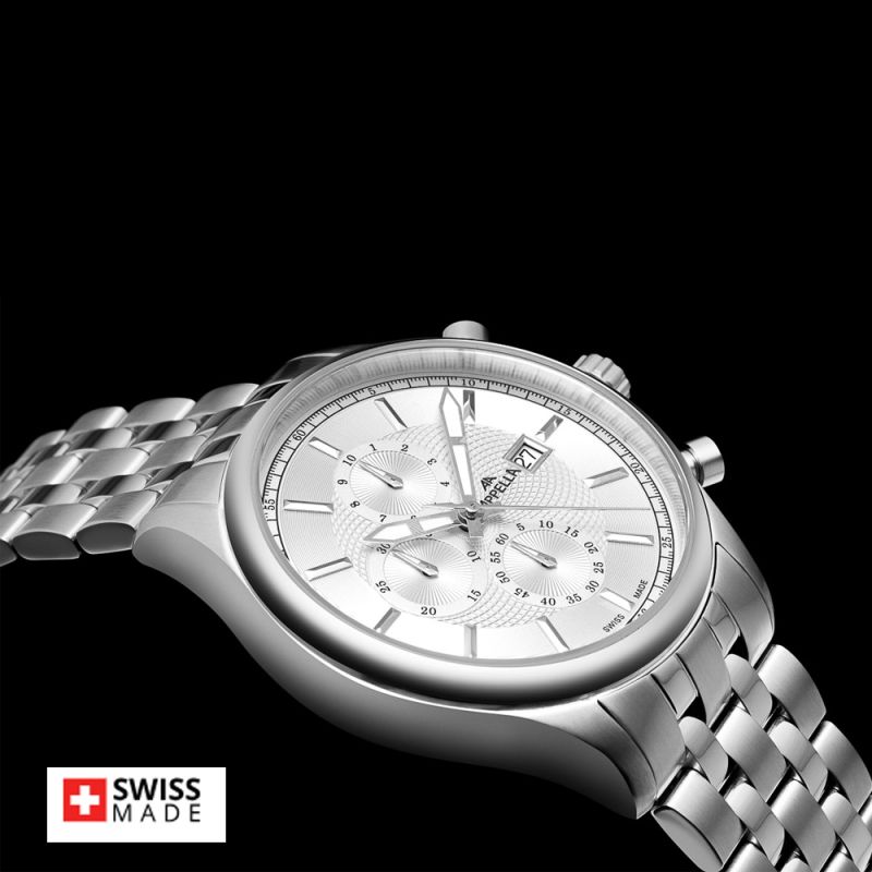 Стилен мъжки часовник Appella L70002.5113CH в сребрист цвят. Корпус и верижка изработени от неръждаема стомана. Моделът е с дисплей хронограф и стъкло сапфир-кристал. Задвижва се от кварцов механизъм RONDA 3540D Swiss Made. Диаметър на корпуса 43 мм. Водоустойчивост 5 ATM - допускат се леки пръски и взимане на душ, не се препоръчва обилно мокрене.