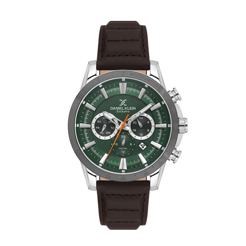 Стилен мъжки часовник Daniel Klein от колекцията Exclusive. Мултифункционален дисплей в зелен цвят с показатели за дата, ден от седмицата и двойно време. Корпус изработен от метал. Тъмнокафява каишка от естествена кожа. Стъкло минерал-кристал. Диаметър на корпуса 45 мм. Часовникът се задвижва от кварцов механизъм JP25-4.5. Водоустойчивост 5 ATM - допускат се леки пръски и взимане на душ, не се препоръчва обилно мокрене.