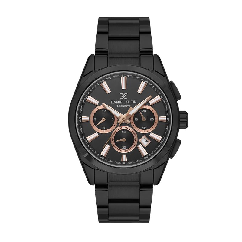 Мъжки часовник Daniel Klein със спортно-ежедневен дизайн от колекцията Exclusive. Черен мултифункционален дисплей с детайли в цвят розово злато. Луминесцентно покритие върху стрелките и индексите. Стъкло минерал-кристал. Корпус изработен от метал. Верижка от неръждаема стомана. Диаметър на корпуса 42 мм. Часовникът се задвижва от кварцов механизъм. Водоустойчивост 5 ATM - допускат се леки пръски и взимане на душ, не се препоръчва обилно мокрене.