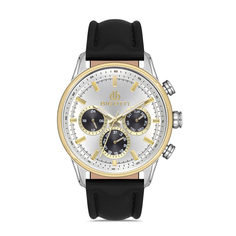 Мъжки часовник Bigotti със спортно-елегантен дизайн от колекцията Milano. Мултифункционален дисплей с показатели за дата, ден от седмицата и 24 часов формат. Стъкло минерал-кристал. Корпус изработен от месинг. Черна каишка от естествена кожа. Диаметър на корпуса 44 мм. Часовникът се задвижва от кварцов механизъм. Водоустойчивост 5 ATM - допускат се леки пръски и взимане на душ, не се препоръчва обилно мокрене.