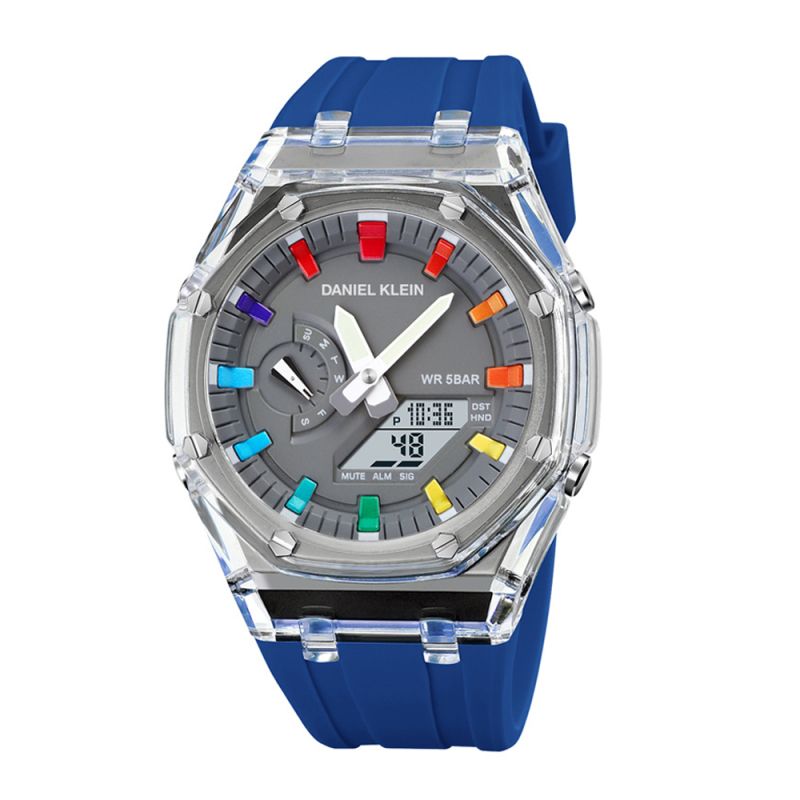 Мъжки часовник Daniel Klein със спортен дизайн от колекцията Digital. Дисплей комбинация от аналогов и дигитален в сив цвят с цветни детайли. Плексигласово стъкло. Корпус изработен от полимер. Силиконова каишка в син цвят. Часовникът има следните функции: показател за дата, ден от седмицата, 12/24 часов формат и аларма. Задвижва се от кварцов механизъм. Водоустойчивост 5 ATM - допускат се леки пръски и взимане на душ, не се препоръчва обилно мокрене.