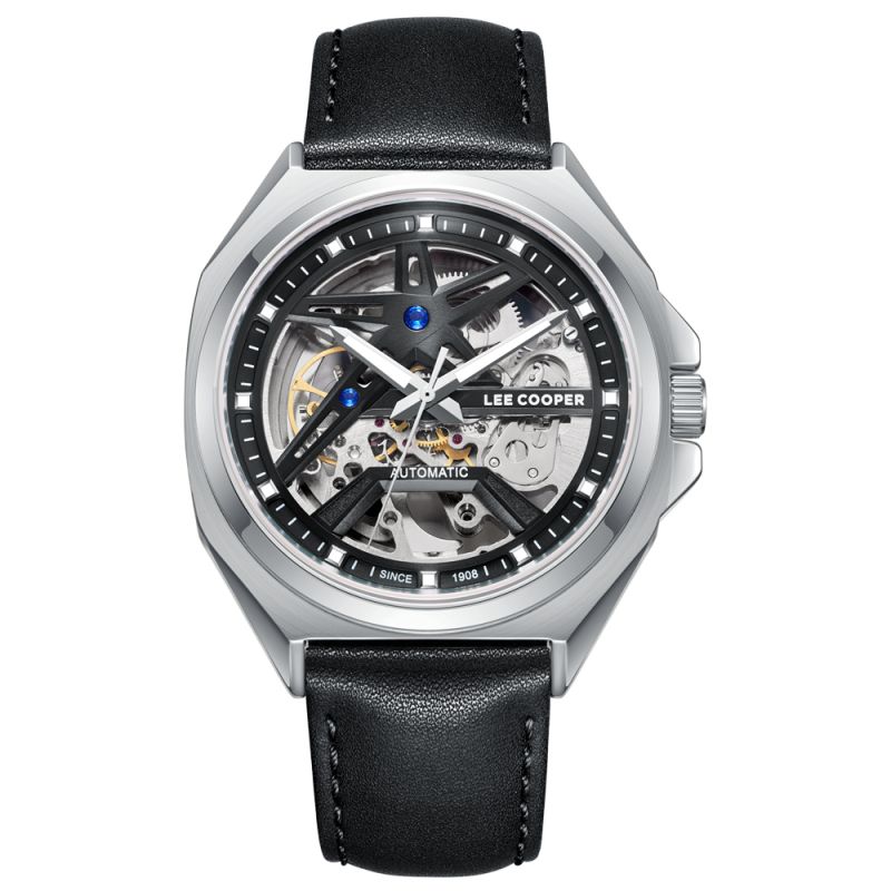 Впечатляващ мъжки часовник Lee Cooper от колекцията Classic. Моделът е с дисплей тип скелетен, през който може да се види автоматичния механизъм калибър G3265ZH. Стъклото е минерал-кристал. Корпусът е изработен от супер метал - специална сплав, създадена от марката. Каишката е от естествена кожа. Диаметър на корпуса 44 мм. Водоустойчивост 5 ATM - допускат се леки пръски и взимане на душ, не се препоръчва обилно мокрене.