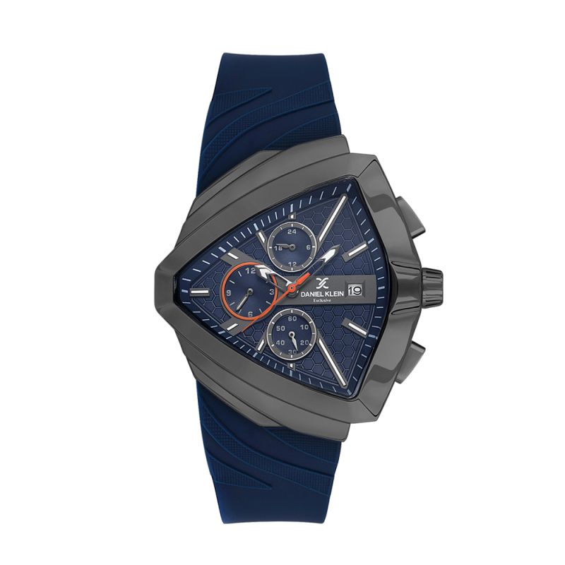 Впечатляващ мъжки часовник Daniel Klein с модерен дизайн от колекцията Exclusive. Мултифункционален дисплей с интересна триъгълна форма. Стъкло минерал-кристал. Моделът е с метален корпус. Тъмносиня силиконова каишка. Задвижва се от кварцов механизъм. Водоустойчивост 5 ATM - допускат се леки пръски и взимане на душ, не се препоръчва обилно мокрене.