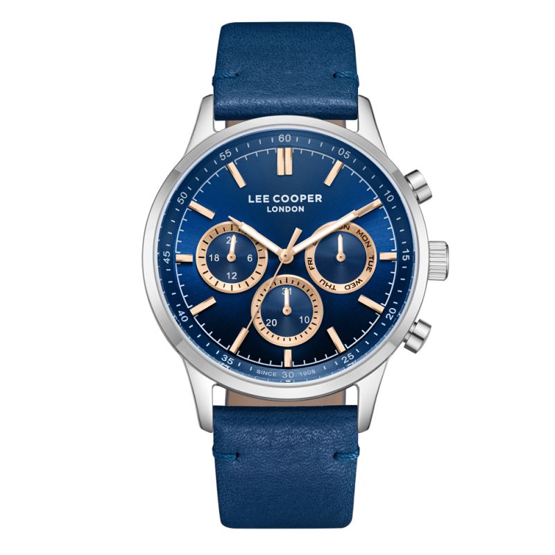Спортно-елегантен мъжки часовник Lee Cooper от колекцията Classic Multifunction. Тъмносин мултифункционален дисплей с детайли в цвят розово злато. Луминесцентно покритие върху стрелките. Стъкло минерал-кристал. Корпус изработен от супер метал - специална сплав, създадена от марката. Каишка от естествена кожа. Задвижва се от кварцов механизъм калибър VX9JE1. Водоустойчивост 3 ATM - допускат се леки пръски, не се препоръчва обилно мокрене.