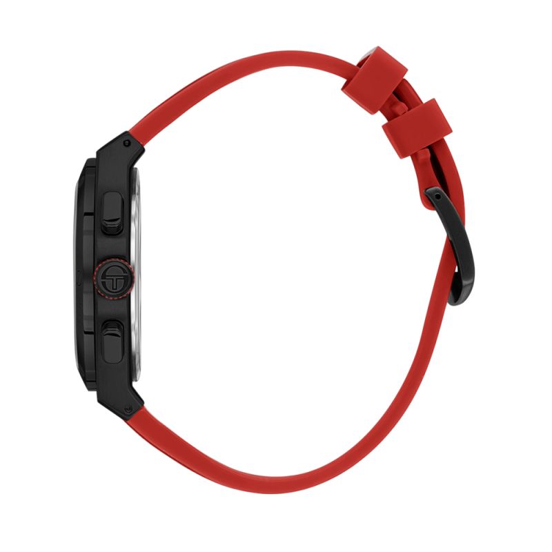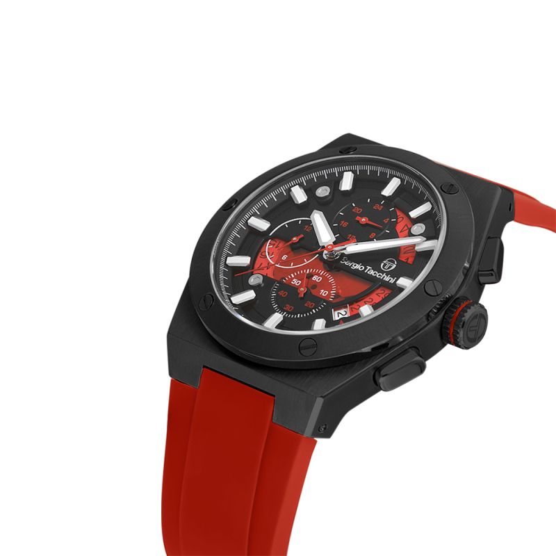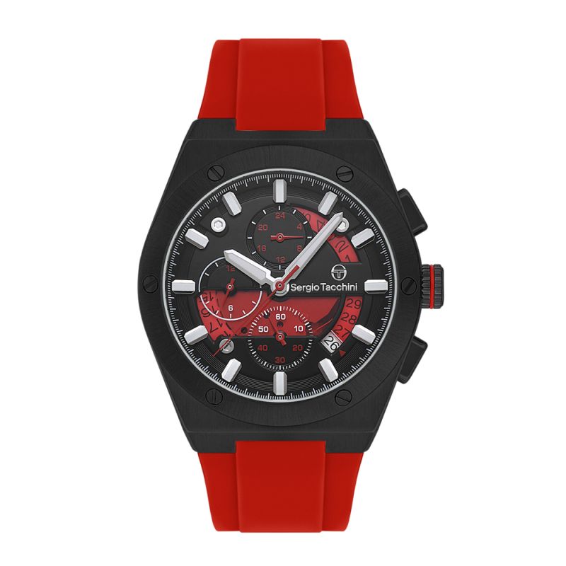 Мъжки часовник Sergio Tacchini със спортно-ежедневен дизайн от колекцията Archivio. Моделът е с мултифункционален дисплей и стъкло минерал-кристал. Корпус изработен от неръждаема стомана.Червена силиконова каишка. Диаметър на корпуса 44 мм. Задвижва се от кварцов механизъм. Водоустойчивост 5 ATM - допускат се леки пръски и взимане на душ, не се препоръчва обилно мокрене.