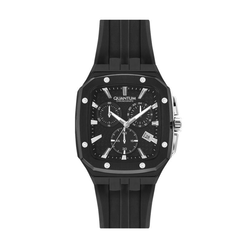 Мъжки часовник Quantum със спортно-ежедневен дизайн от колекцията Hunter. Дисплей хронограф в черен цвят със сребристи детайли. Луминесцентно покритие върху стрелките. Стъкло минерал-кристал с антирефлексно покритие. Корпус от неръждаема стомана в комбинация със силиконова каишка. Задвижва се от кварцов механизъм. Водоустойчивост 10 ATM - позволява мокрене, къпане и плуване във водни басейни.