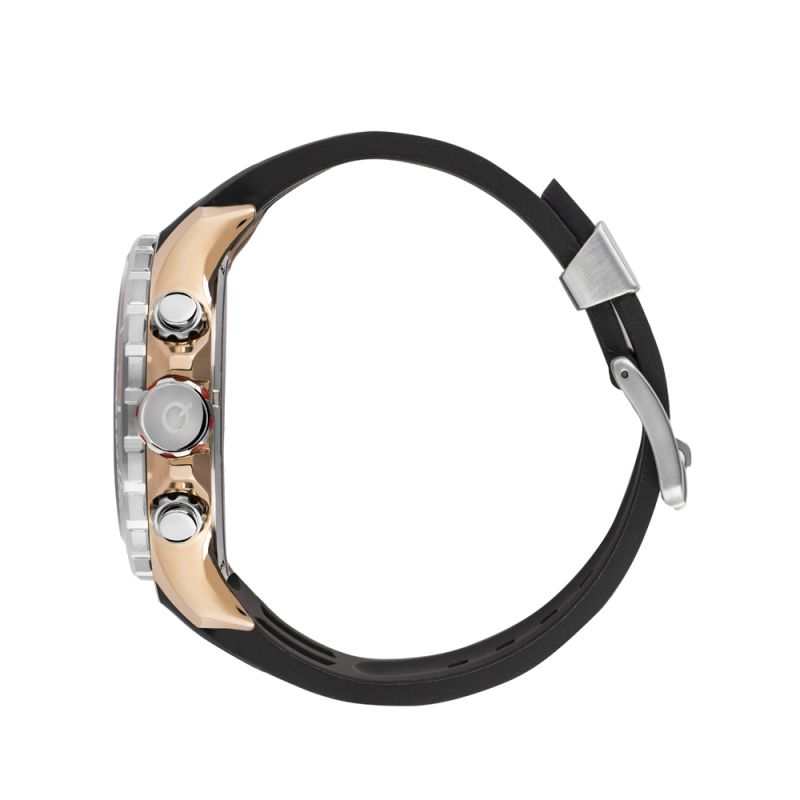 Мъжки часовник Quantum със спортен дизайн от колекцията Hunter. Черен дисплей хронограф с детайли в цвят розово злато. Луминесцентно покритие върху стрелките и индексите. Стъкло минерал-кристал с антирефлексно покритие. Корпус изработен от неръждаема стомана. Черна силиконова каишка със сребристи акценти. Часовникът се задвижва от кварцов механизъм с калибър VR34A. Водоустойчивост 10 ATM - позволява мокрене, къпане и плуване във водни басейни.