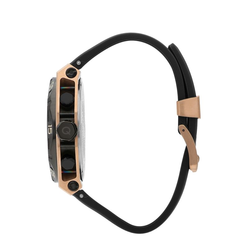 Мъжки часовник Quantum с интересен и модерен спортно-ежедневен дизайн от колекцията Hunter. Дисплей тип хронограф в черен цвят с детайли в цвят розово злато. Луминесцентно покритие върху стрелките и индексите. Стъкло минерал-кристал с антирефлексно покритие. Корпус от неръждаема стомана. Черна силиконова каишка. Задвижва се от кварцов механизъм с калибър VR34B14. Диаметър на корпуса 50 мм. Водоустойчивост 10 ATM - позволява мокрене, къпане и плуване във водни басейни.