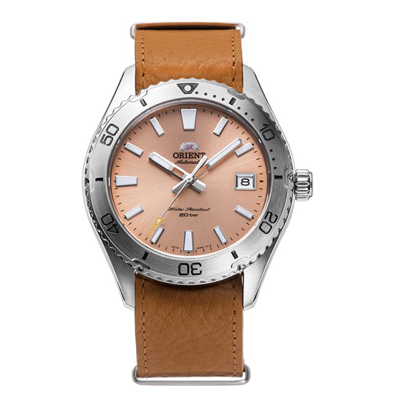 Часовник Orient със спортно-елегантна визия. Моделът е с компактен корпус от 39,9 мм, идеален както за мъже, така и за жени. Корпус от неръждаема стомана, съчетан с кафява каишка от естествена кожа. Аналогов дисплей с изчистен дизйн в бежов цвят с показател за дата. Луминесцентно покритие на стрелките и индексите. Стъкло сапфир-кристал. Часовникът се задвижва от автоматичен механизъм Cal.F6722 с 40 часа резерв на мощност и има завинтена коронка. Водоустойчивост 20 ATM - позволява мокрене, къпане, плуване и гмуркане във водни басейни.