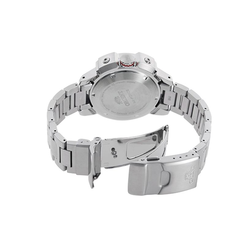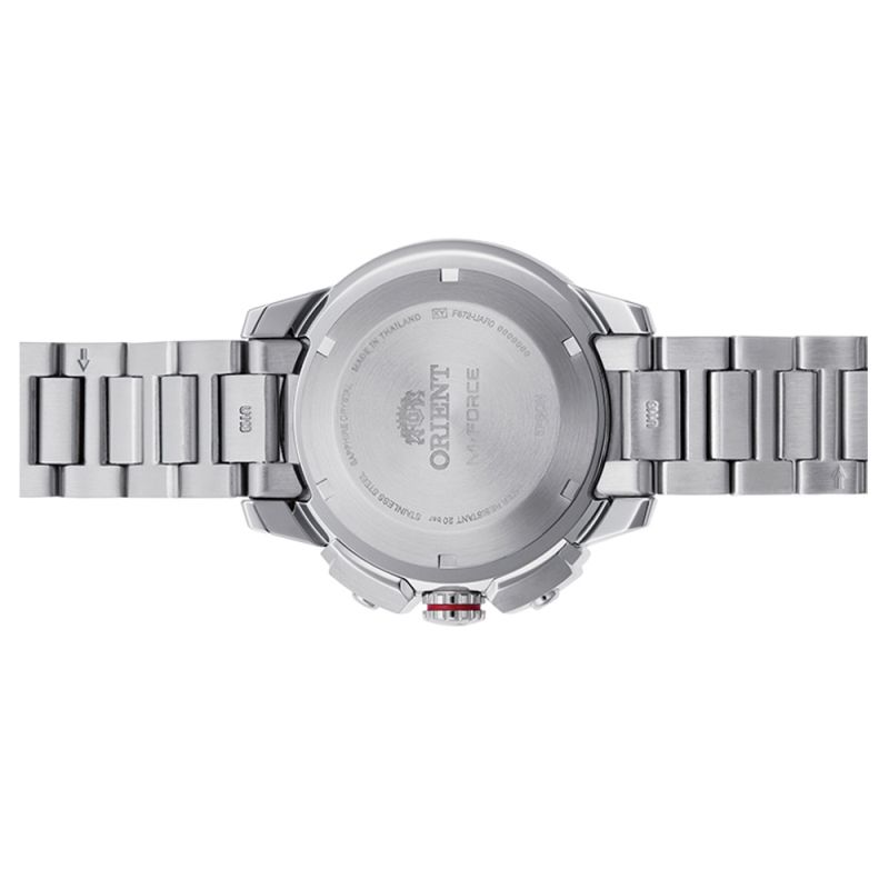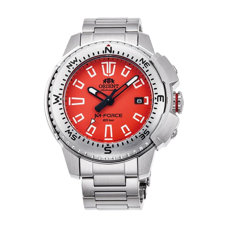 Спортен модел мъжки часовник Orient M-FORCE A-AC0N02Y, създаден за любителите на приключенията и силните усещания. Здравината и издръжливостта са интегрирани във всеки детайл на дизайна, отличителен двупосочен компасен безел и голям защитен щит, който предпазва безела и въртящата се коронка. Оранжев аналогов дисплей с показател за дата. Стрелки и индекси с луминесцентно покритие. Стъкло сапфир-кристал. Корпус и верижка изработени от неръждаема стомана. Водоустойчивост 20 ATM - позволява мокрене, къпане, плуване и гмуркане във водни басейни. Задвижва се от автоматичен японски механизъм Cal.F6727.