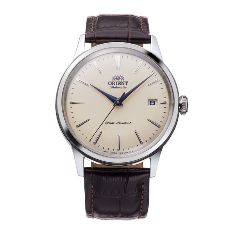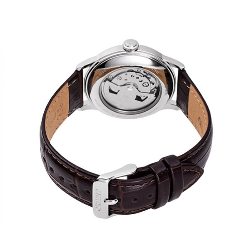 Класически часовник Orient със стилен дизайн от колекцията Classic. Моделът е с компактен корпус от 38 мм, идеален както за мъже, така и за жени. Часовникът е с автоматичен механизъм F6724, от серията 46-F6 на Orient, осигуряващ висока производителност и надеждност. Красивият завършек на механизма, може да бъде видян през прозрачния гръб. Куполообразното стъкло и изпъкналият бежов циферблат със сребристи лентови индекси, създават винтидж усещане. Корпусът е изработен от неръждаема стомана и е съчетан с кафява каишка от естствена кожа. Стъклото е минерал-кристал. Водоустойчивост 3 ATM - допускат се леки пръски, не се препоръчва обилно мокрене.