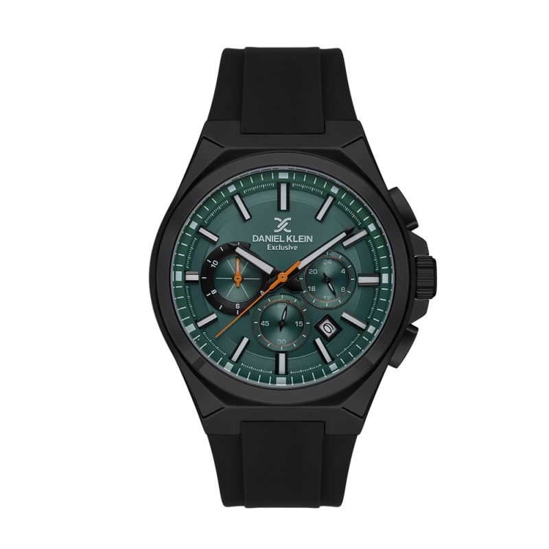 Спортен мъжки часовник Daniel Klein с модерен дизайн от колекцията Exclusive. Мултифункционален дисплей с луминесцентно покритие върху стрелките и индексите. Стъкло минерал-кристал. Корпус изработен от метал. Силиконова каишка в черен цвят. Диаметър на корпуса 45 мм. Часовникът се задвижва от кварцов механизъм. Водоустойчивост 5 ATM - допускат се леки пръски и взимане на душ, не се препоръчва обилно мокрене.