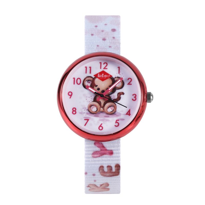 Детски часовник Lee Cooper. Аналогов дисплей с изображение на сладко животинче. Стъкло минерал-кристал. Корпус от поликарбонат в комбинация с текстилна каишка. Задвижва се от кварцов механизъм. Водоустойчивост 3 ATM - допускат се леки пръски, не се препоръчва обилно мокрене.
