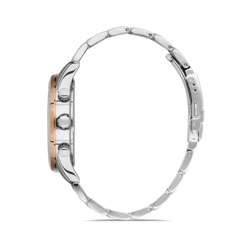 Мъжки часовник с модерен спортно-елегантен дизайн. Тъмносив дисплей тип хронограф с детайли в цвят розово злато. Луминисцентно покритие върху стрелките и индексите. Стъкло минерал-кристал. Корпус и верижка изработени от неръждаема стомана. Моделът се задвижва от кварцов механизъм. Водоустойчивост 5 ATM - допускат се леки пръски и взимане на душ, не се препоръчва обилно мокрене.