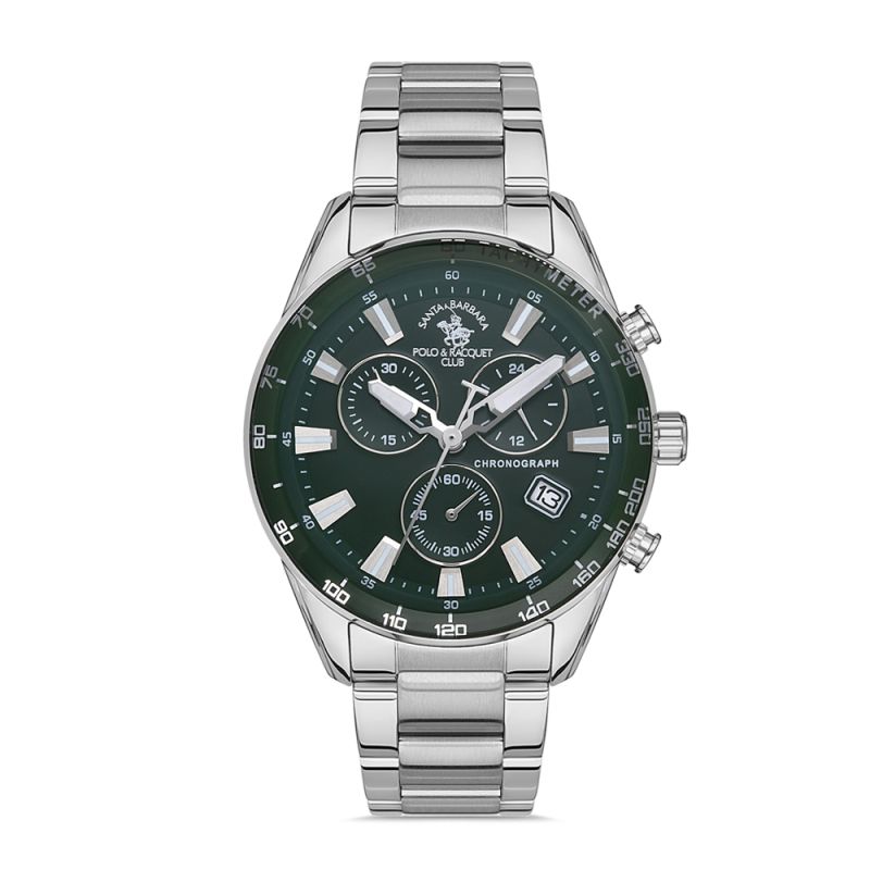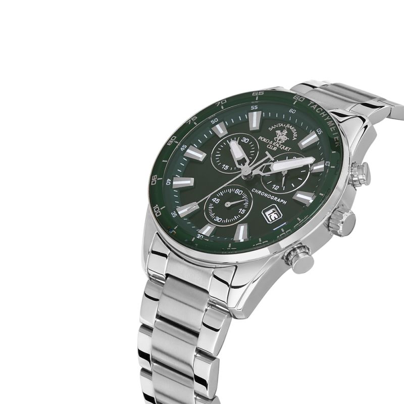 Мъжки часовник с модерен спортно-елегантен дизайн. Дисплей тип хронограф в зелен цвят със сребристи детайли. Луминисцентно покритие върху стрелките и индексите. Стъкло минерал-кристал. Корпус и верижка изработени от неръждаема стомана. Моделът се задвижва от кварцов механизъм. Водоустойчивост 5 ATM - допускат се леки пръски и взимане на душ, не се препоръчва обилно мокрене.