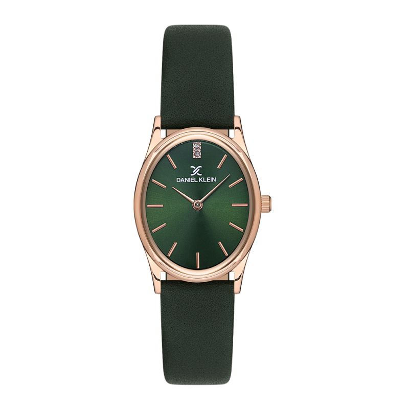 Нежен модел дамски часовник Daniel Klein от колекцията Premium. Зелен аналогов дисплей с декорация от два кристала на 12 часа. Стъкло минерал-кристал. Метален корпус. Каишка от естествена кожа. Кварцов механизъм. Водоустойчивост 3 ATM - допускат се леки пръски, не се препоръчва обилно мокрене.