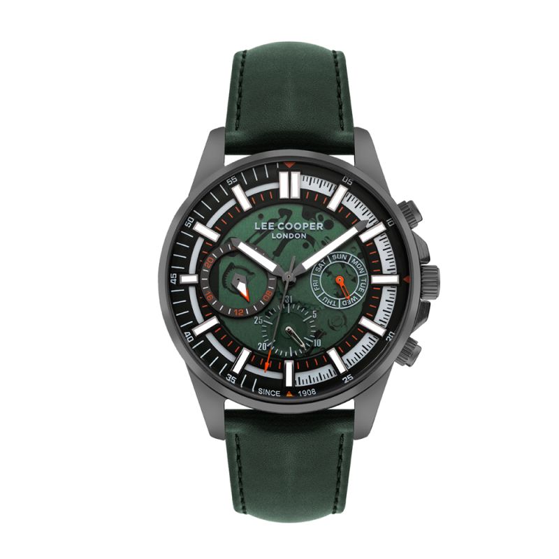 Спортно-елегантен мъжки часовник Lee Cooper. Мултифункционален дисплей с луминисцентно покритие на стрелките и индексите. Стъкло минерал-кристал. Корпус изработен от супер метал в комбинация с каишка от естествена кожа. Задвижва се от кварцов механизъм. Водоустойчивост 5 ATM - допускат се леки пръски и взимане на душ, не се препоръчва обилно мокрене.
